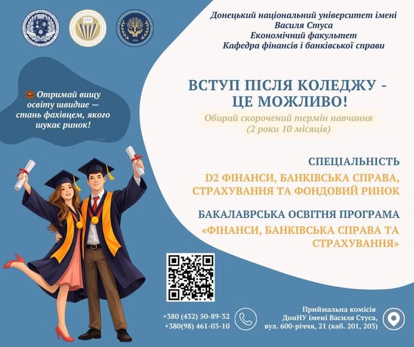 Якщо ти вже маєш диплом фахового молодшого бакалавра або молодшого спеціаліста, скористайся скороченим терміном навчання за освітньою програмою «Фінанси, банківська справа та страхування» у Донецький національний університет імені Василя Cтуса.