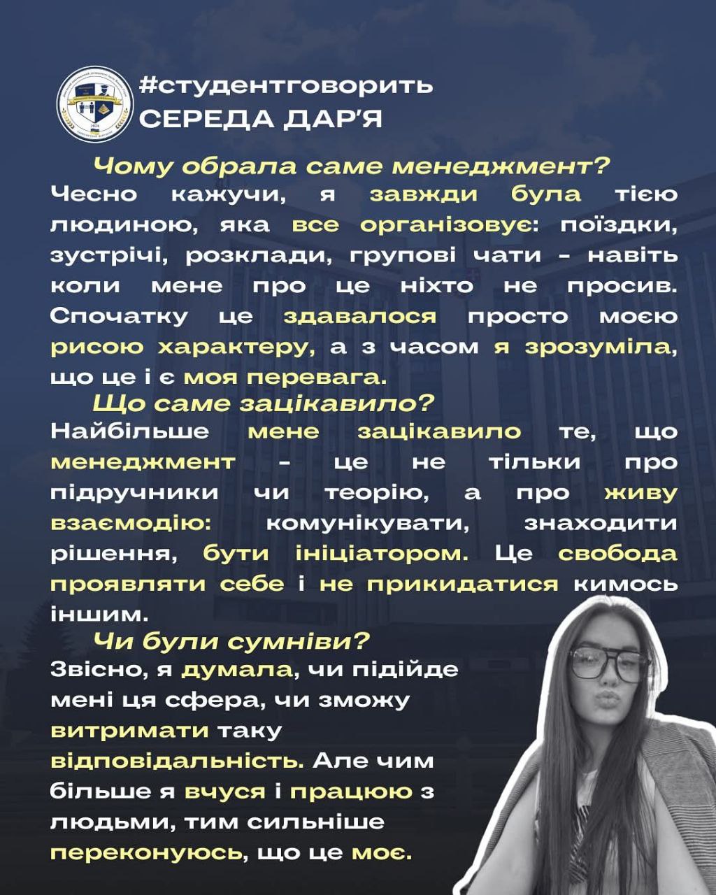 Дар’я обрала менеджмент, бо це не тільки про теорію з підручників, а про справжню взаємодію: комунікацію, ініціативу, сміливість приймати рішення й бути собою.