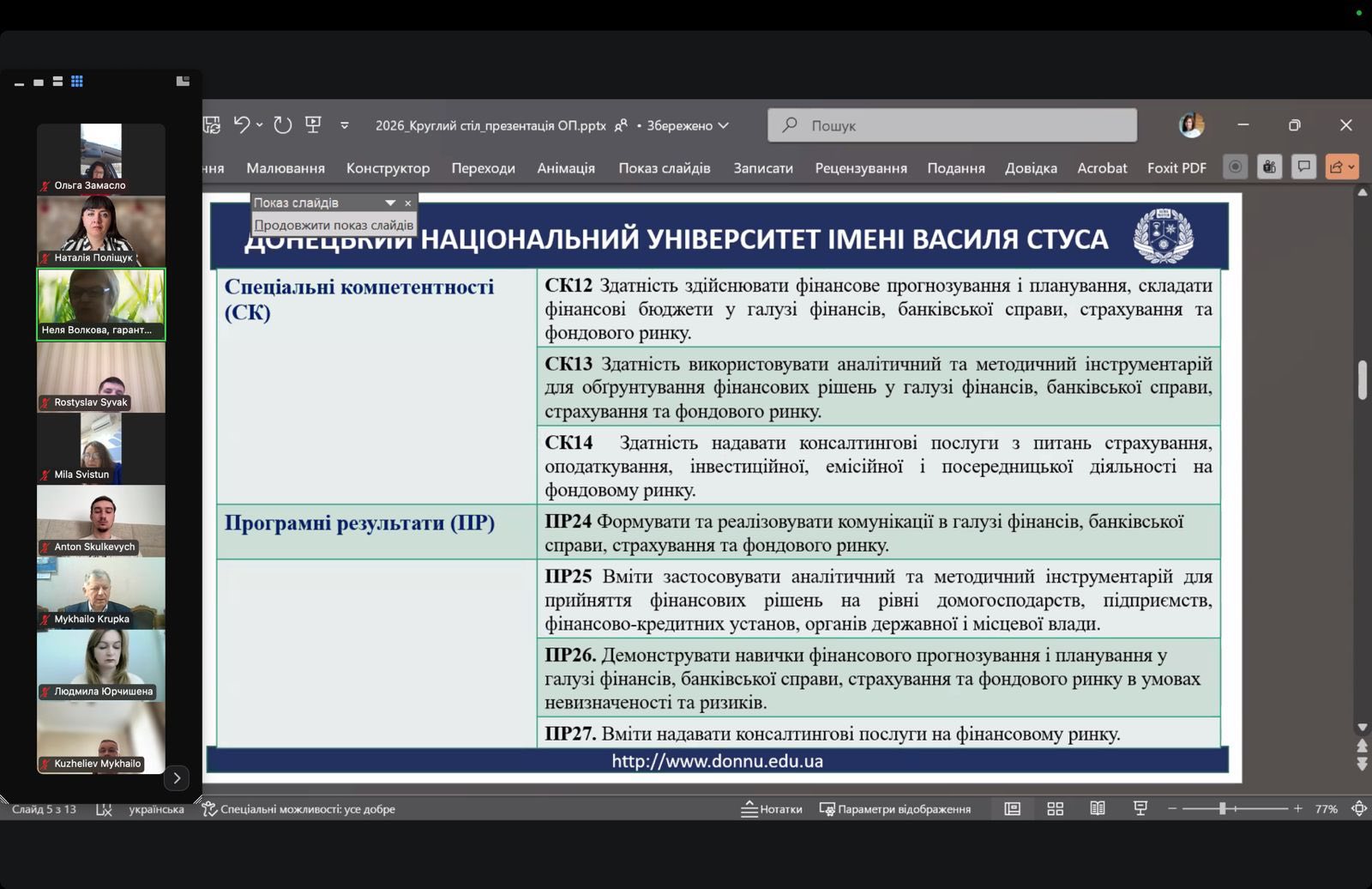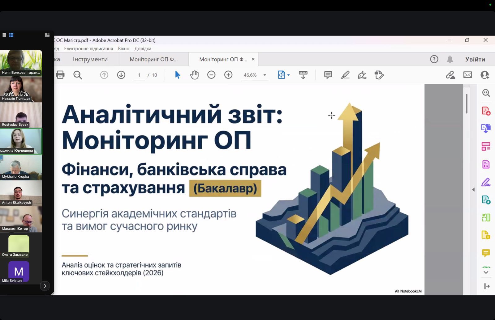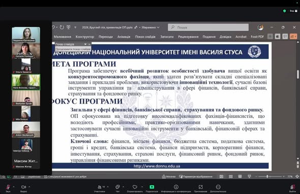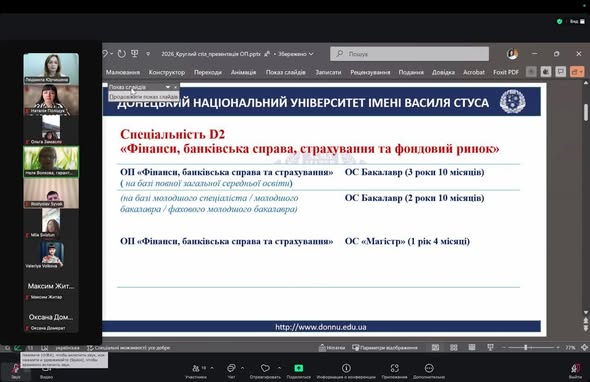 Керівник проєктної групи, гарант ОП «Фінанси, банківська справа та страхування» ОС «Магістр» д. е. н., завідувач кафедри фінансів і банківської справи Людмила ЮРЧИШЕНА (Людмила Юрчишена) та гарант ОП «Фінанси, банківська справа та страхування» ОС «Бакалавр» к. е. н, доцент Неля ВОЛКОВА (Неля Волкова) представили зміни до освітніх програм та результати анкетування стейкхолдерів (роботодавці, академічна спільнота, випускники і студенти).