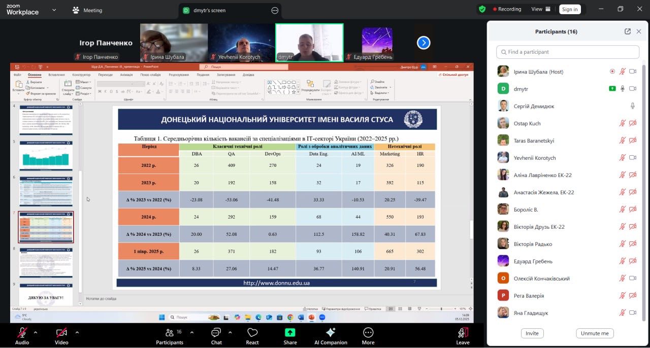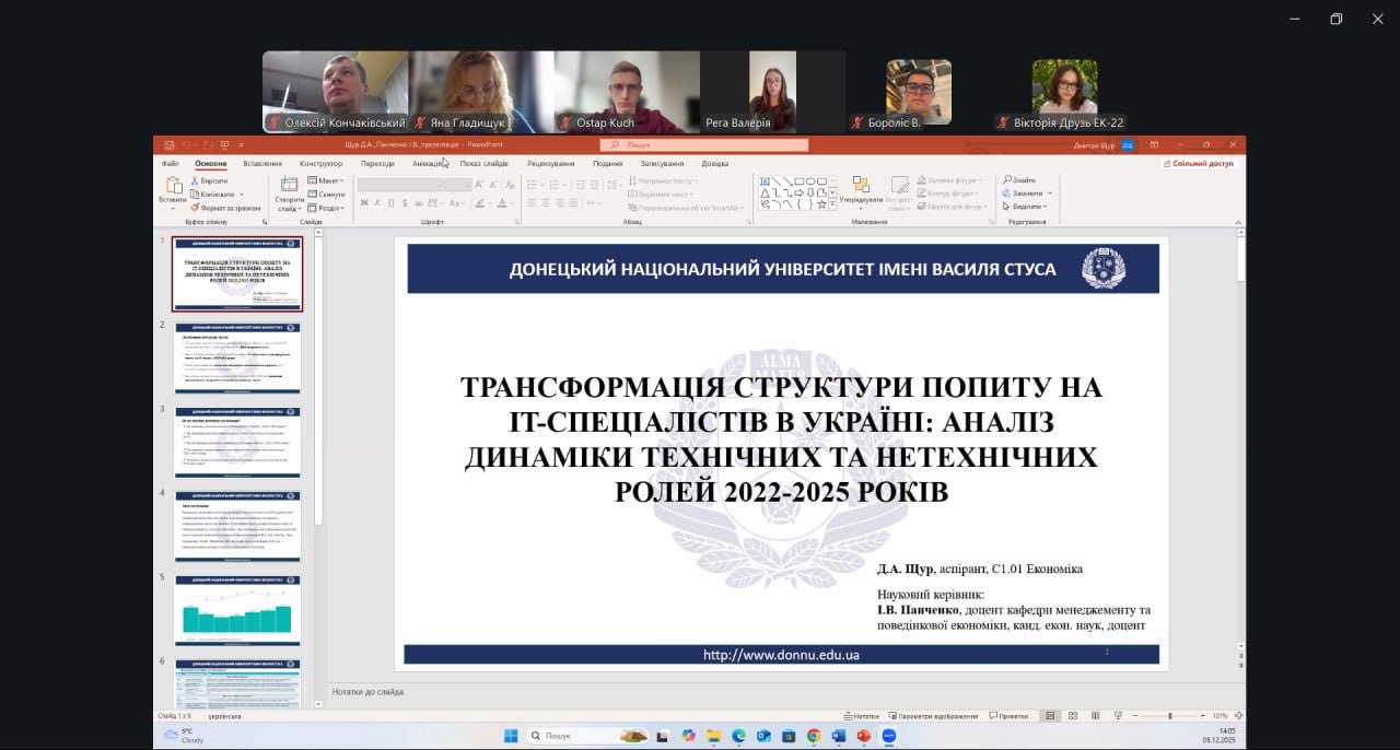 – в секції пленарних виступів здобувачів нашу кафедру представив аспірант 1 року навчання ОНП «Економіка» Дмитро Щур із доповіддю «Трансформація структури попиту на IT-спеціалістів в Україні» (науковий керівник – доцент Ігор Панченко).