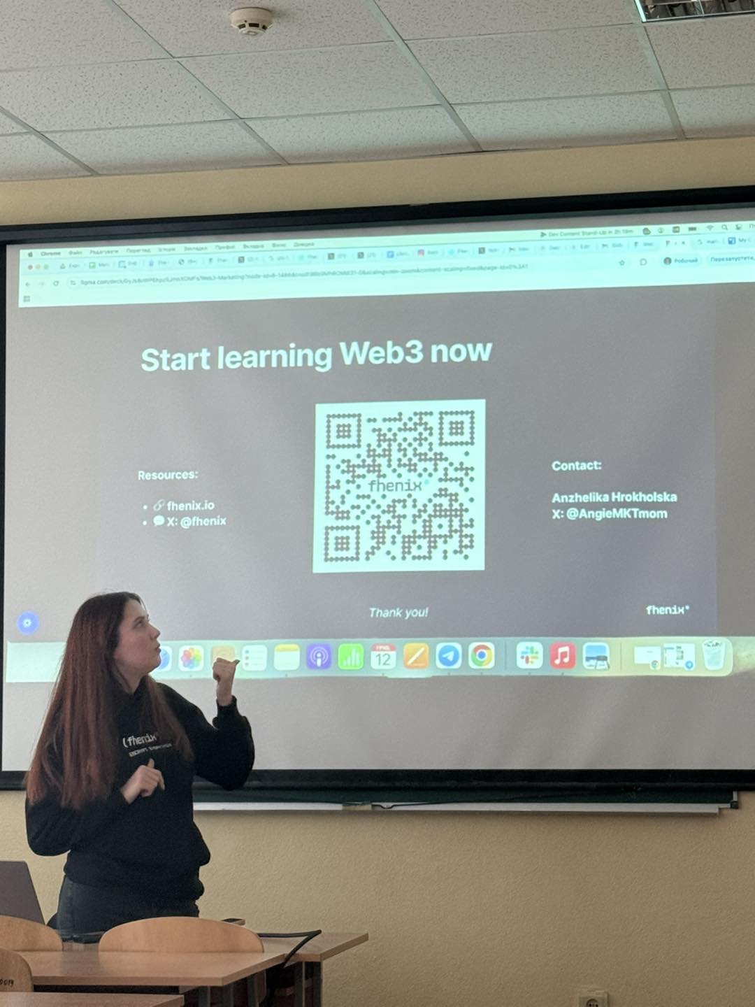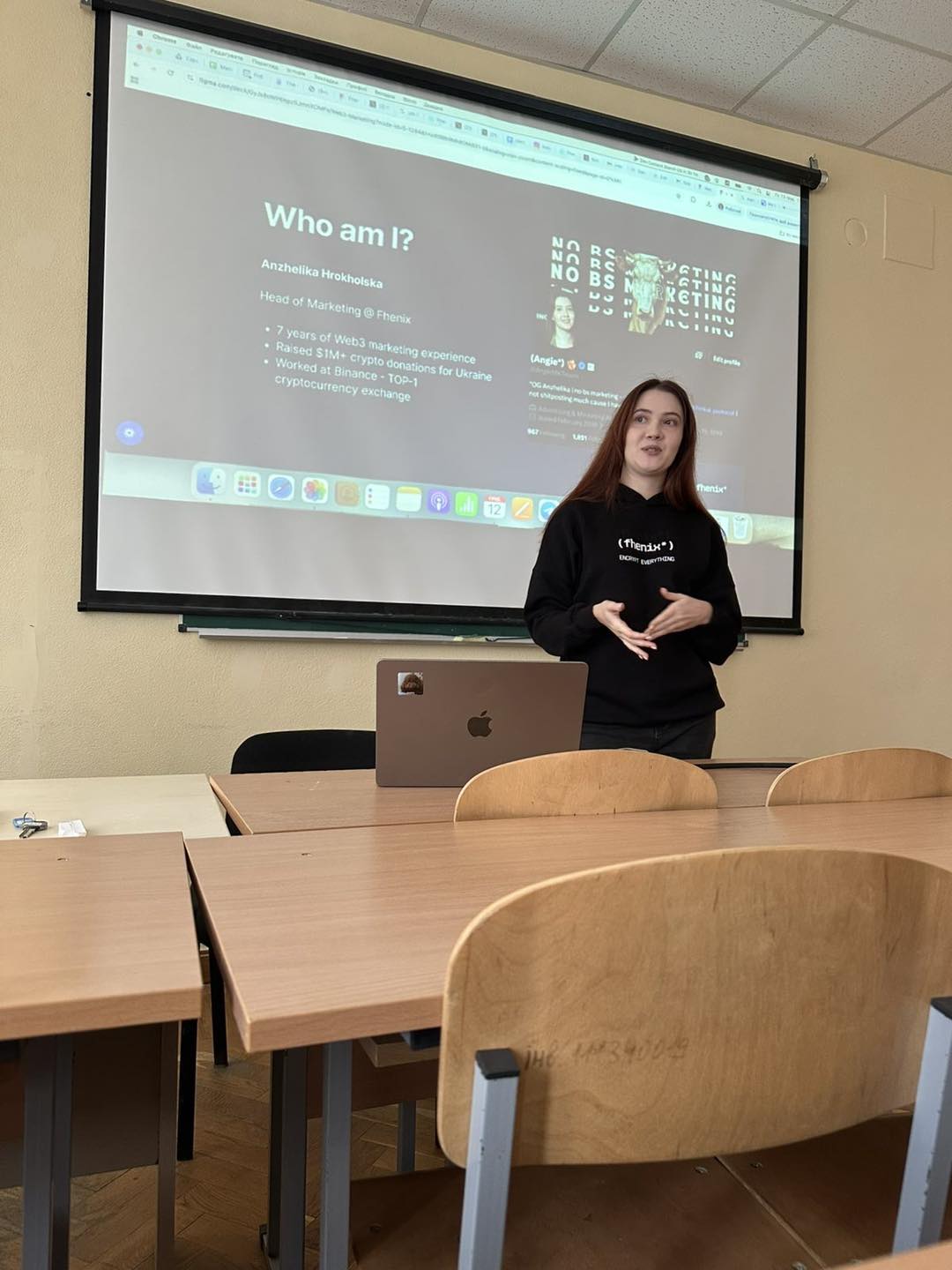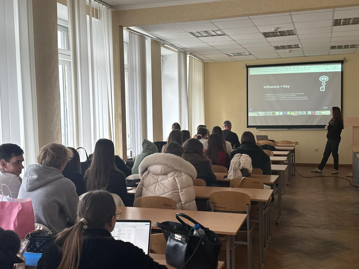 Подія об’єднала здобувачів освіти та учасників в онлайн і офлайн форматах у живій та динамічній атмосфері. Спікерка Анжеліка Грохольська (FHENIX.IO) поділилася актуальними підходами до інфлюенс-маркетингу, роллю AI та Web3 у сучасній цифровій економіці.