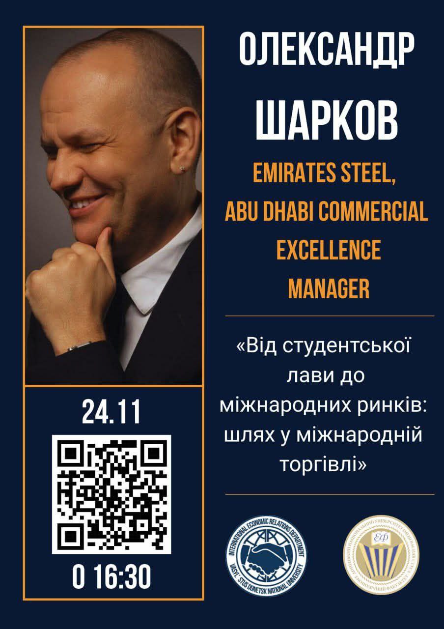 Раді познайомити вас зі спікером — це Олександр Шарков, який побудував успішну кар’єру та наразі обіймає посаду Commercial Excellence Manager у компанії Emirates Steel (Абу-Дабі, ОАЕ).